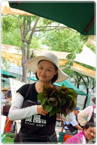 這位美女則是戴慶芳大哥的太太,戴慶芳大哥已經好幾個禮拜沒有出現在市集了,原來他去進修深迼了,農夫也要不斷地學習才會有新的想法~他去報名參加高雄大學開的精緻農產品加工班,每天都要上課,等他結訓回來,應該會有一些新的東西在市集出現,我們期待吧~對了,美女手上拿的是”紫蘇”,我們一般拿來醃梅子或做料理用~