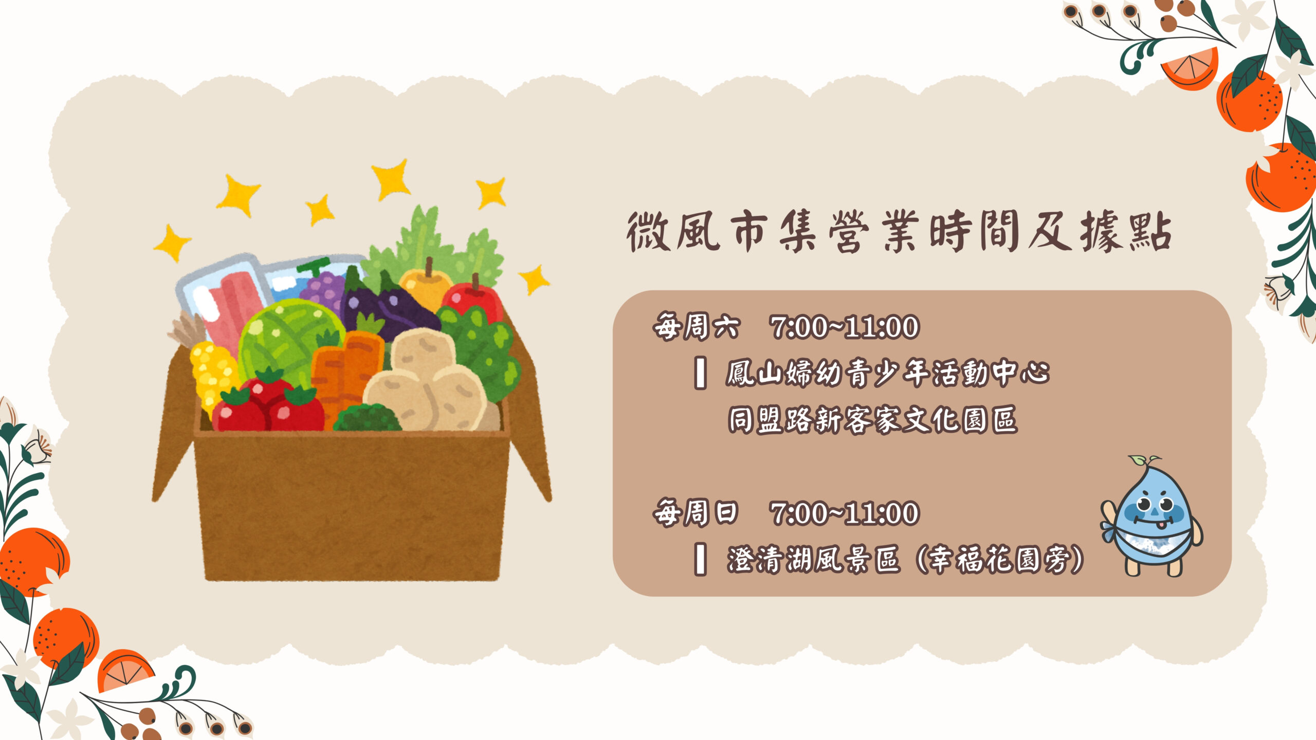 01-市集營業時間02-市集簡介03-17周年慶04-物產館結束營運05-澄清湖試營運 照顧生產小農 維護農友合理收益與生產者面對面 友善對待土地 地產地銷與土地做朋友 維護食物安全 安全食糧 手工製造 落實社區互助 農民、社區及社福團體共同合作 微風大小事市集最新訊息、最夯活動快報,都在這裡~ 最新訊息 認識微風好農農友們的耕作理念、心路歷程、農場位置。 微風臉譜 有機怎麼吃手路菜食譜大公開,做得開心,吃得安心。 有機小食譜